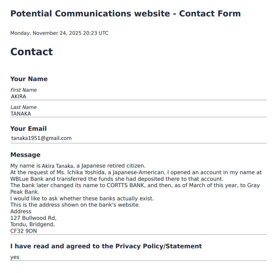 I received a contact form submission followed by several emails from a Japanese citizen called Akira Tanaka *. He seemed to have fallen victim to what is known as a "Romance scam".