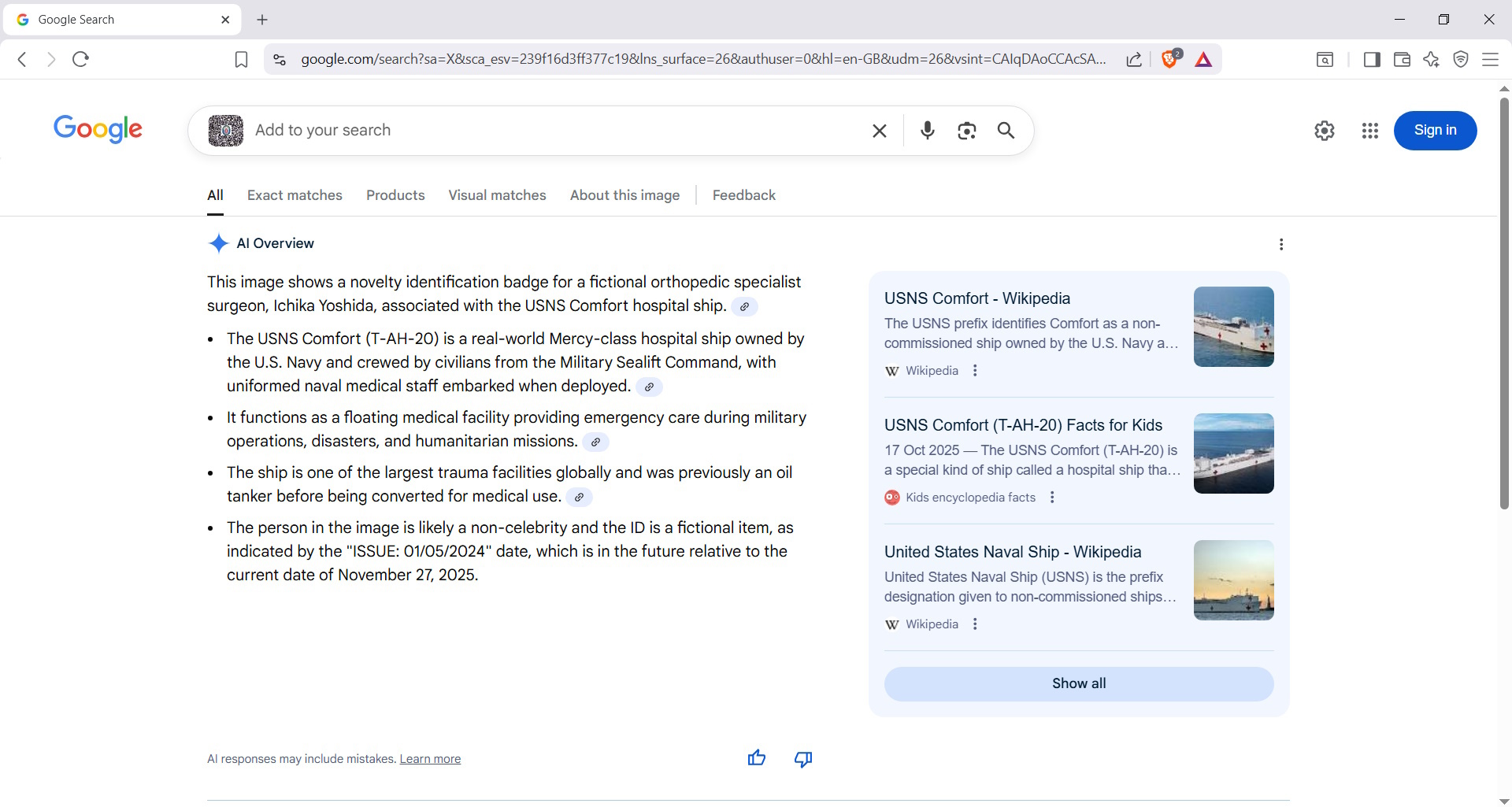 She is not on this hospital ship as a surgeon. Google search shows no link of this person with the ship.