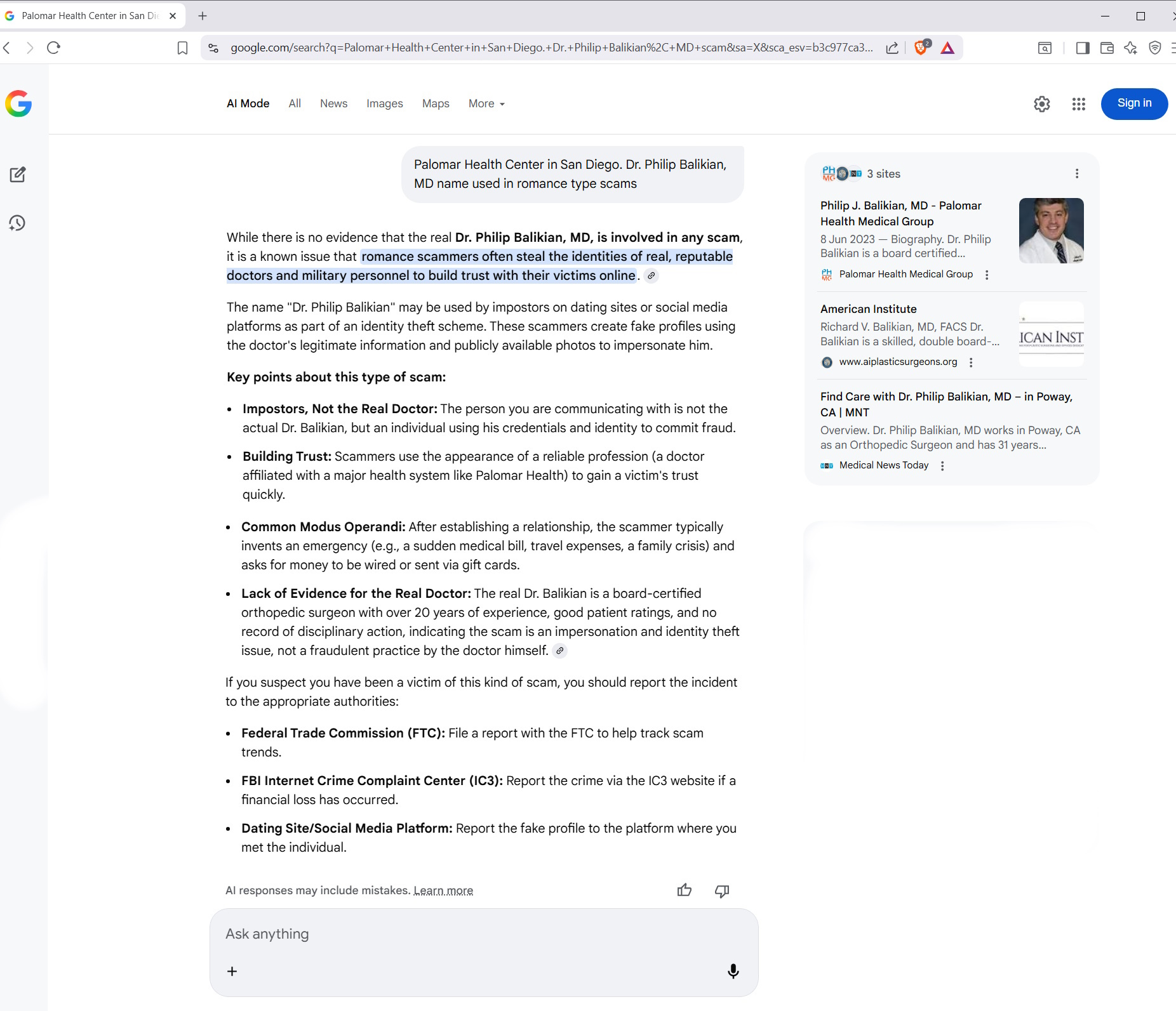 Dr Philip Balikian, MD is a surgeon at the Palomar but I doubt he contacted you, see attached screenshot j7. First request for money $36,782 is more money that a retired couple in the UK would receive each year in the form of state retirement pensions! Ms Chka (I think you mean Ms Ichika) already knew!!