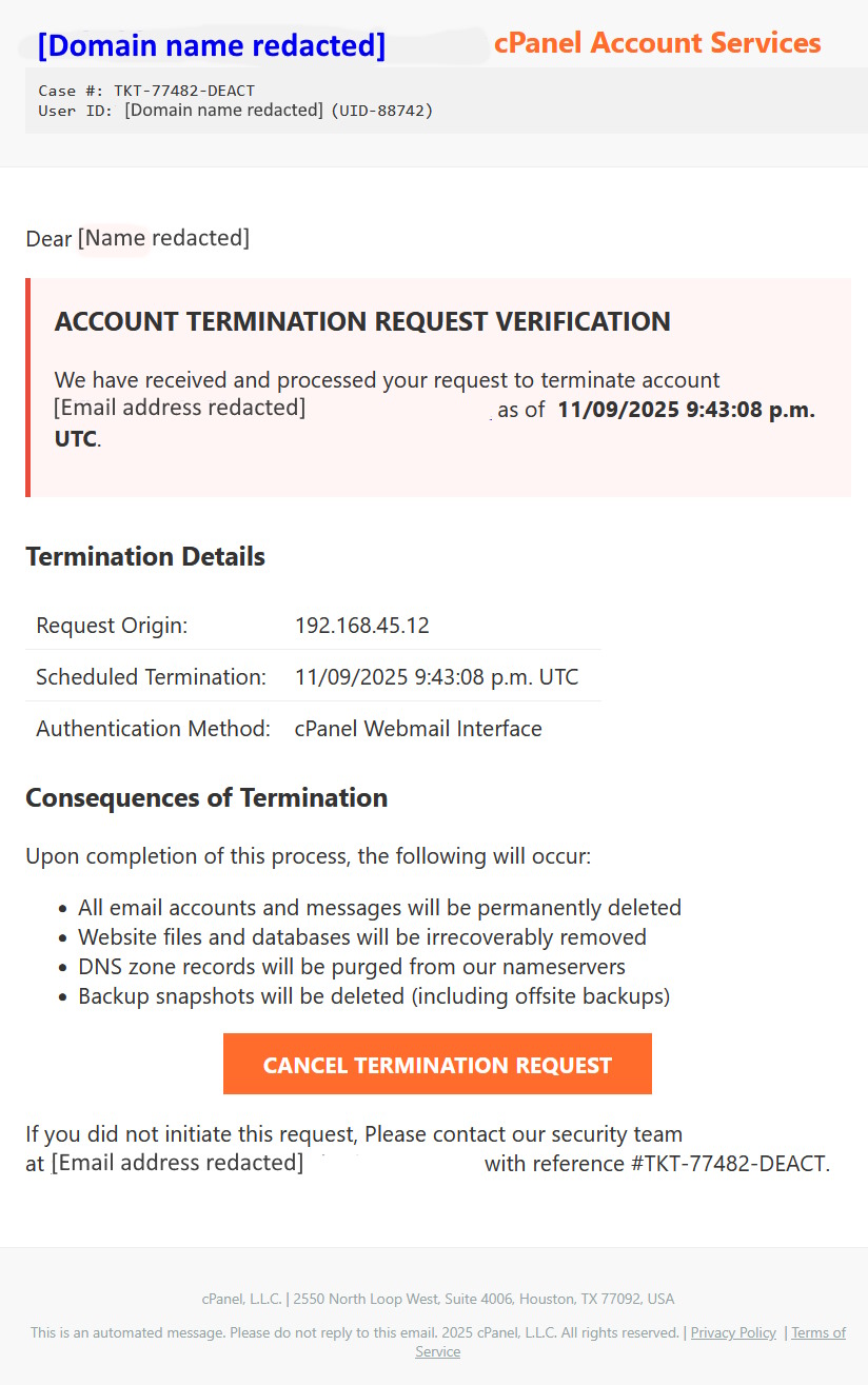 Panic sets in. If you don't click on the link and cancel the termination notice everything will go... all your emails, files, and everything associated with your cPanel Account Services but you don't have cPanel Account Services! cPanel is just the control panel interface your hosting account uses. This is a phishing scam and quite a well crafted one...