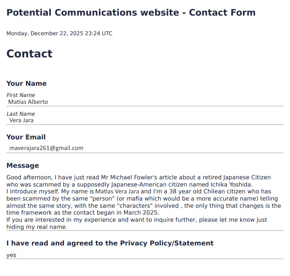 I hope this message can be understandable and sorry for the delay and lack of some details, perhaps, if you want, I can share with you the mails for more information. I cut off all contact with Ichika and related characters. I blocked her on Whatsapp and all email holders who have been scamming me. Ichika wrote me an email and blocked her too. I even received a Whatsapp message from supposedly Frederick Spencer after Christmas but I didn't reply. I will send all this background information to Fiscalía because there's someone in Chile involved and I want her in prison, maybe this criminal band can be dissolved from my sue.