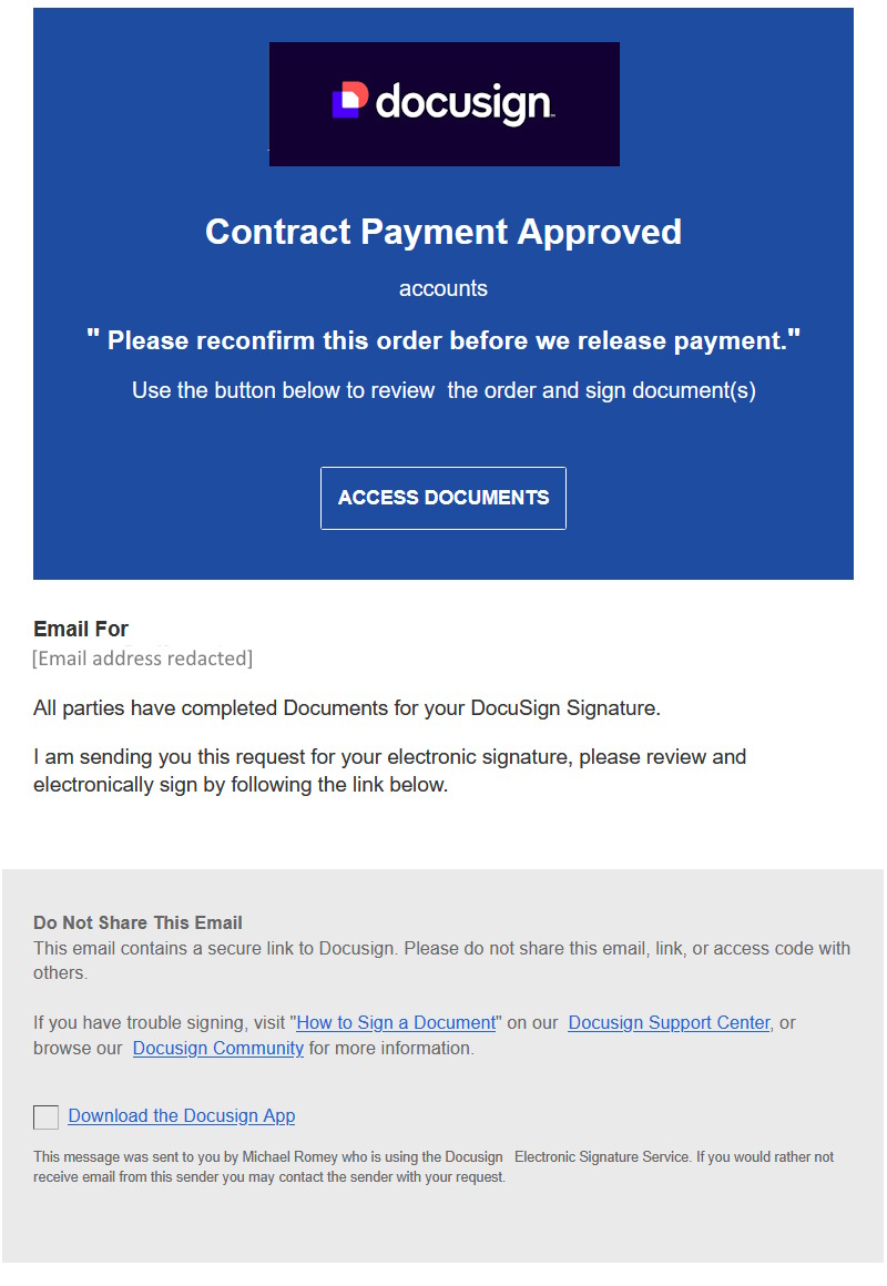 I was not expecting any Docusign notification for an EFT (Electronics Fund Transfer) contract so I knew it was a scam email to try and obtain my login details. Same rules apply who sent it you and where will the click through link take you?