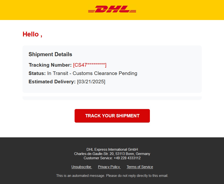 Genuine communications from DHL should come from dhl.com e-mail addresses and clickable links should be to dhl.com website pages. The e-mail comes from info@invoiceerver.org e-mail address (reply to address support@invoiceerver.org). Reading the address quickly you may think you are reading invoiceserver.org, but there is no letter "s" in the e-mail address. A whois search shows invoiceerver.org was registered on 20th Mar 2025, only 1 day before the e-mail was sent. Very suspicious for a long established brand such as DHL. When trying to access the website you are warned that it is a dangerous website involved in phishing.