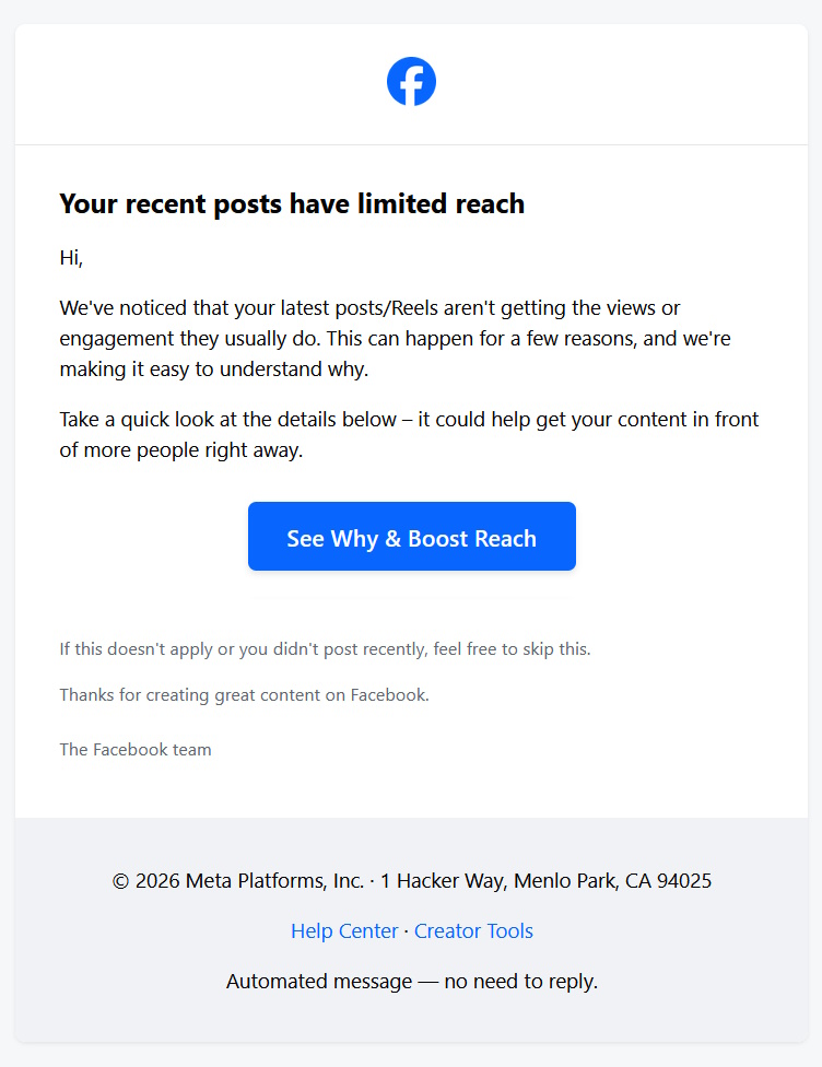 Notes: Sender email address: support@frenchgeneric.space... nothing like an official facebook email address.