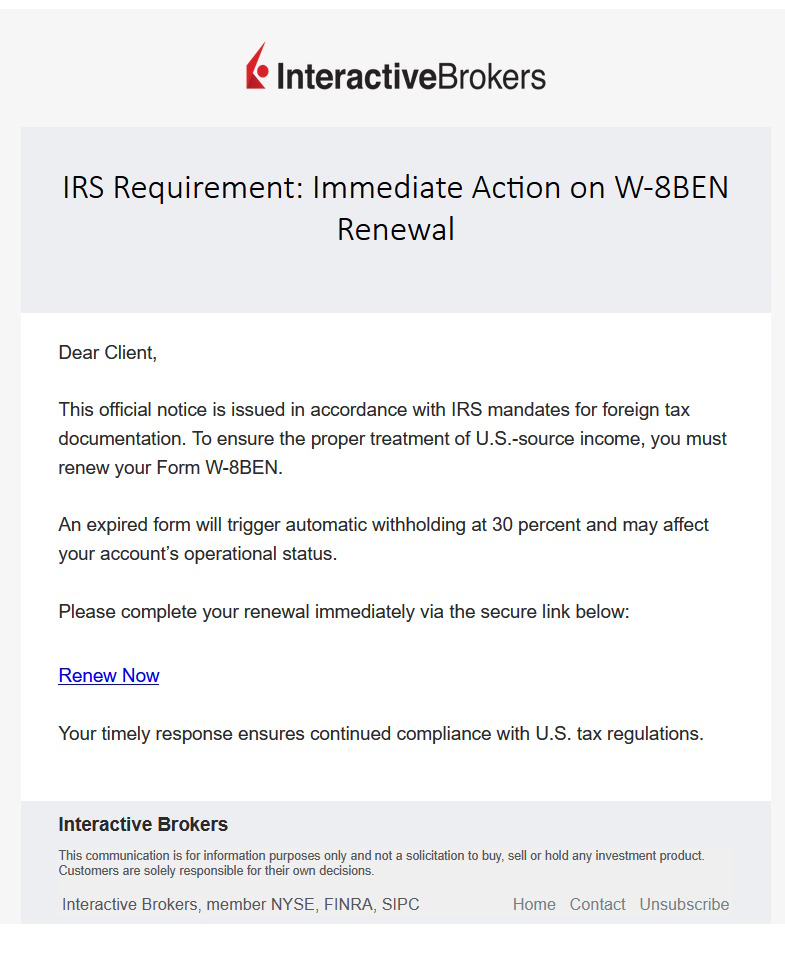 We received another email from scammers pretending to be Interactive Brokers, again wishing you to click on a link and go to a fake page.