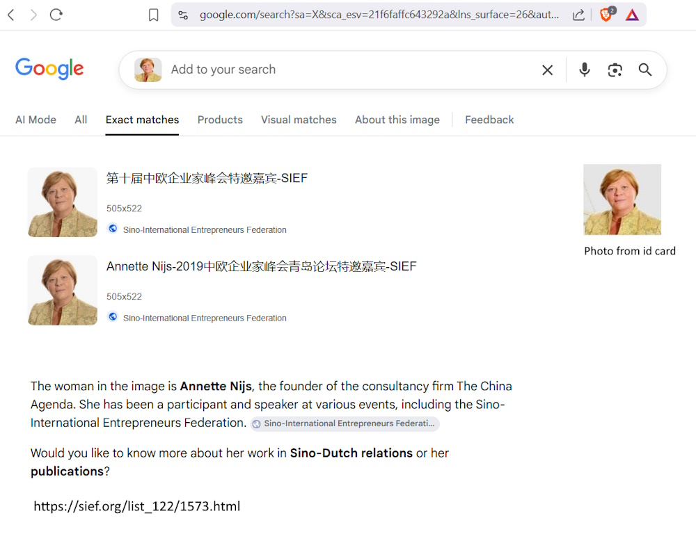 3. I mentioned that I had discovered that the photograph used on the Daisy Joseph id card appeared online as a retired Dutch politician called Annette Nijs (I includede screenshots of the pages where the photograph appeared).