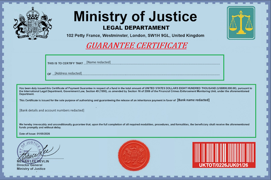 I very quickly received another email with fake documents supposedly guaranteeing this large sum of money to me. I attach the documents with my fake details redacted also a barrister is introduced which will be the first person I am expected to send a fee to.