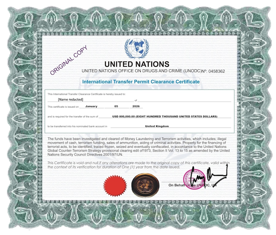 Please be informed once again that every due process towards the transfer of your fund into your designated bank account is completed.