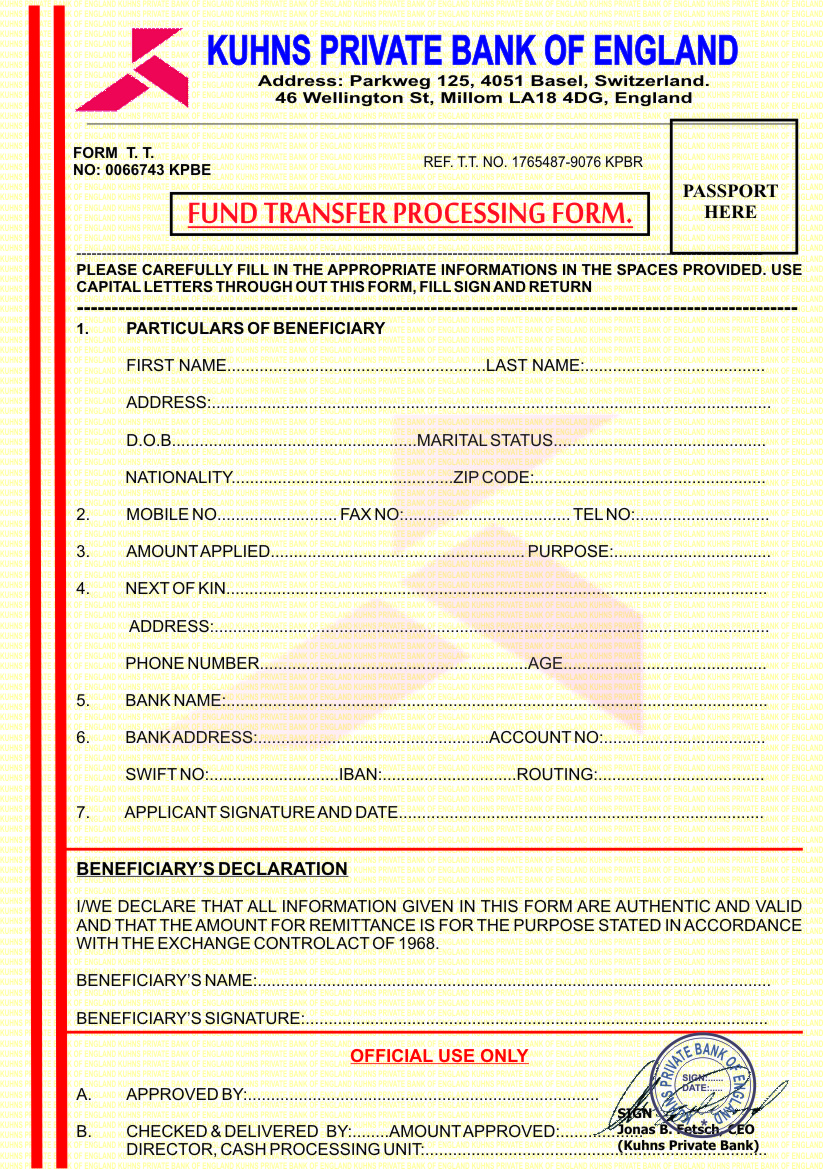 The second fee supposedly payable after you have received your "Fund" is US$3,600 Professional Fees. Now this is interesting... they will not send you any money but you need to be convinced that you have the money "in your hands". Probably this is where the fake bank Kuhns comes in... the money will be initially be deposited there (a fake deposit) until you have paid the fees from your own money.