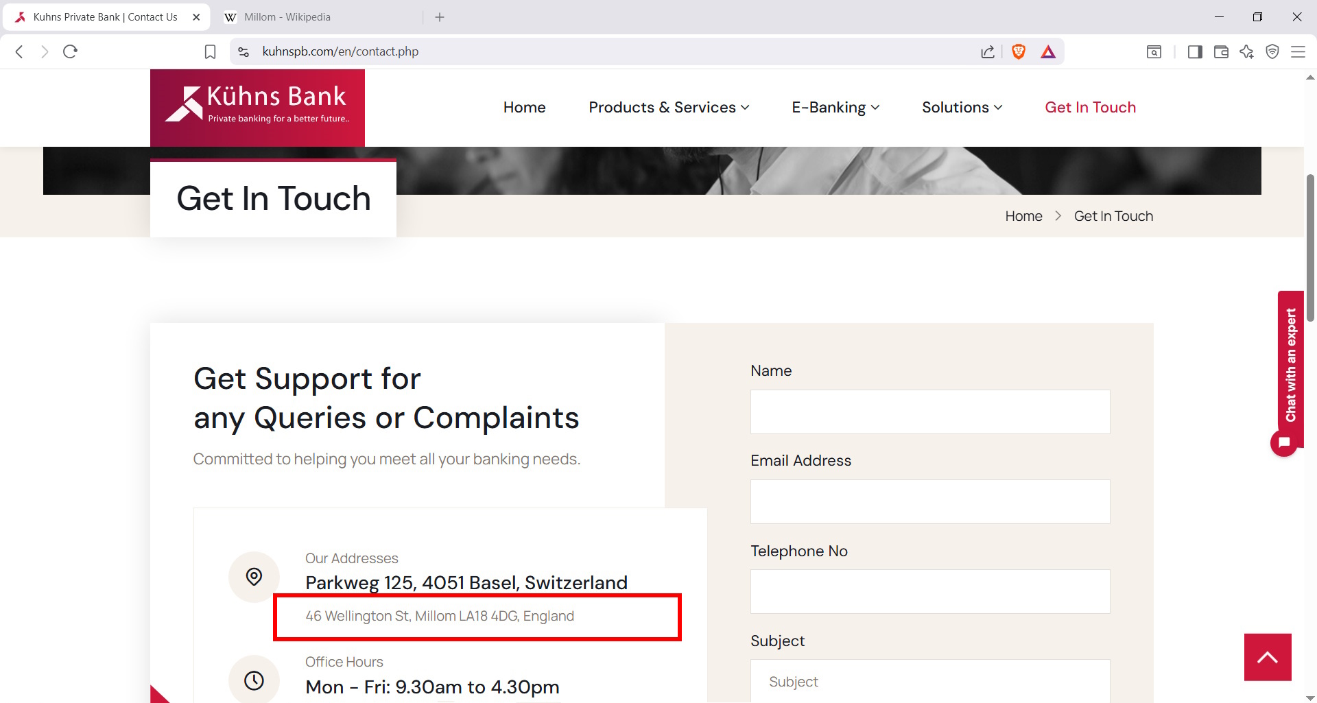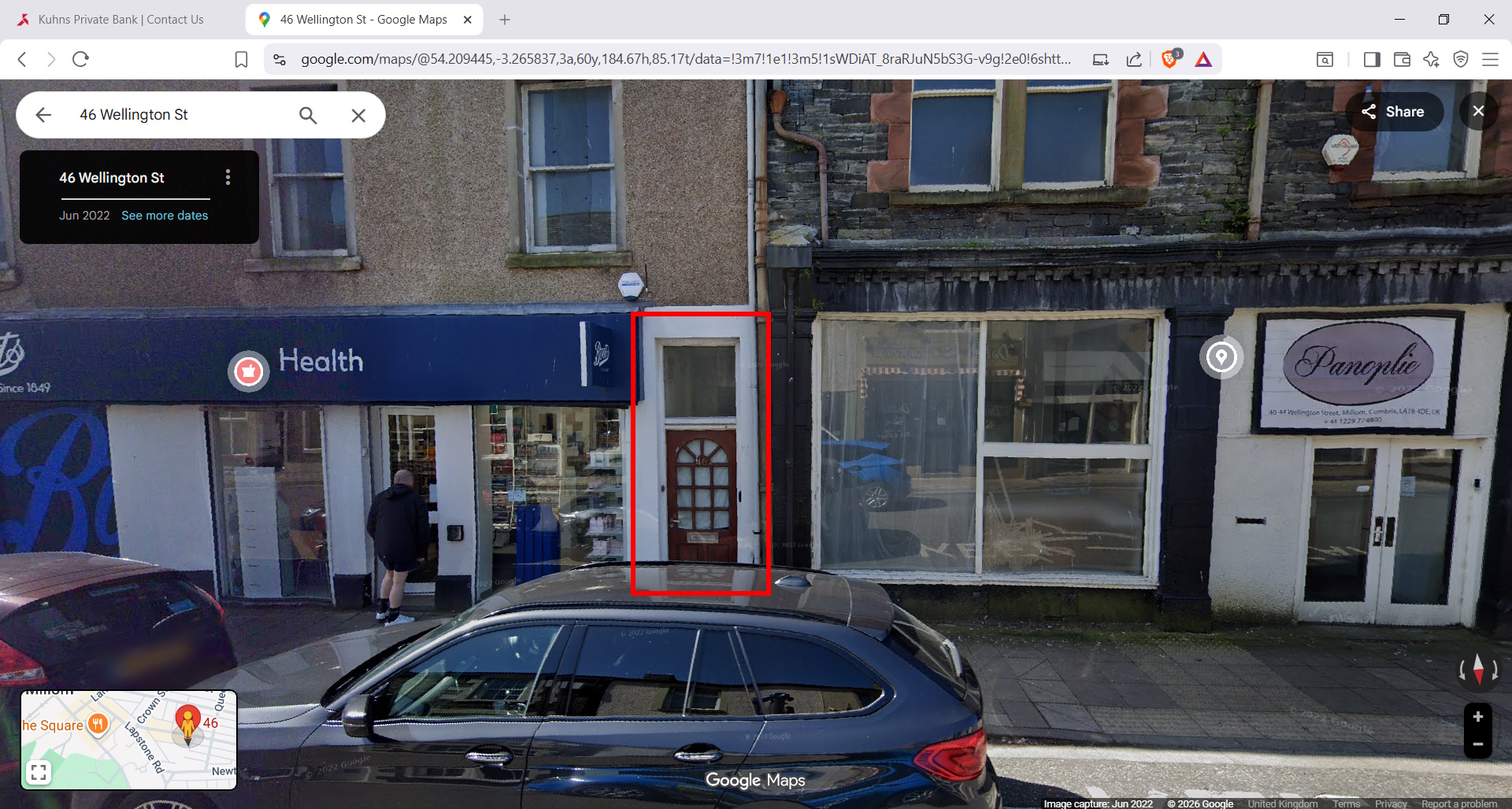 We were quite disappointed but further investigation on google and using the ai function led us to: https://www.kuhnspb.com/en/ which is an "all-singing all-dancing" website that I might expect from a leading private bank with headquarters in Basel, Switzerland and a UK branch office in Millom, specifically at "46 Wellington St, Millom LA18 4DG, England". Now for those of you not familiar with UK Geography I will give you a little bit of background about Millom. It is a small town of just over 7,250 and it is literally in the "back of beyond" in northern England. We have not visited Millom and no doubt Millom residents like their little town (or else if they could they would have left) but it it is not likely to be the location of the only British branch of a Swiss Private Bank. I will show a Google streetview image of the actual doorway to what is claimed to be the Millom Bank branch.