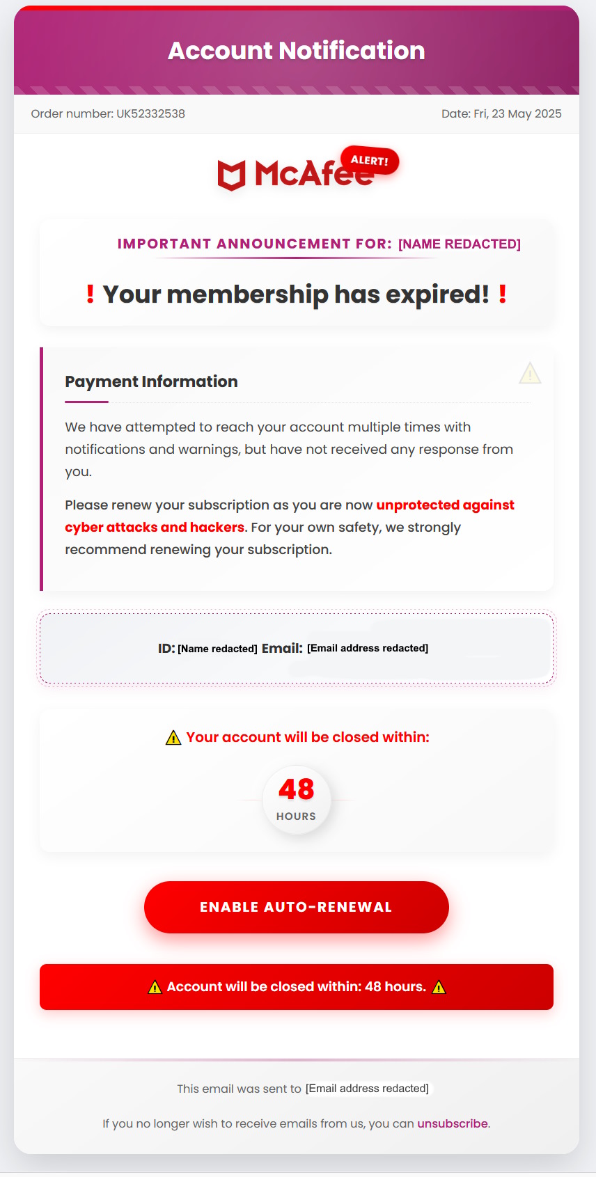 There is also an unsubscribe link which will take you to http://graf.1109121.ru/1xVmgG199RQab17xnldstqwkx432RCYXOLLOTFPAEHG2901693NHTB226V4. again the same Russian website. McAfee do not operate out of Russia. Do not click on any links.