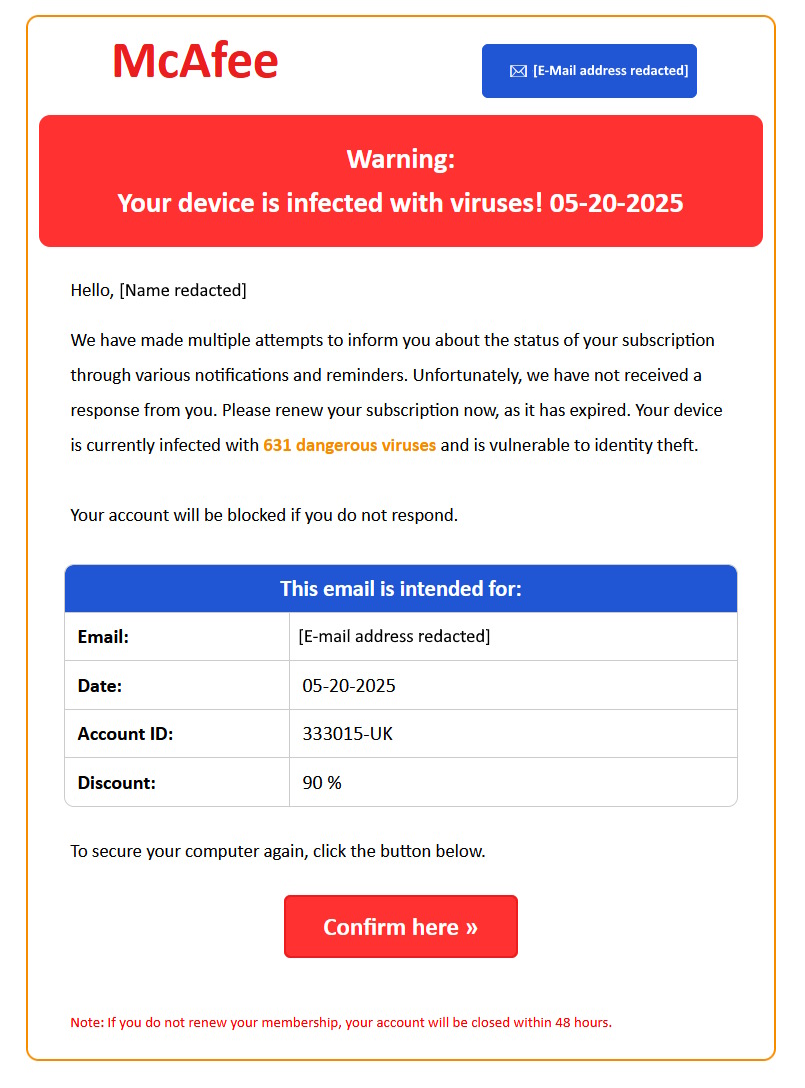 Notes: A different sender email address, the domain was registered many years ago but does not have a website on the domain. I apparently have 631 dangerous viruses... scare tactics. The click through link goes to http://btre.rohl.nom.za/4UskUk1446Egzp34iwniaxqjwq432USIXJIWJSCLLYJG2901693LPBG282e4 nothing to do with McAfee