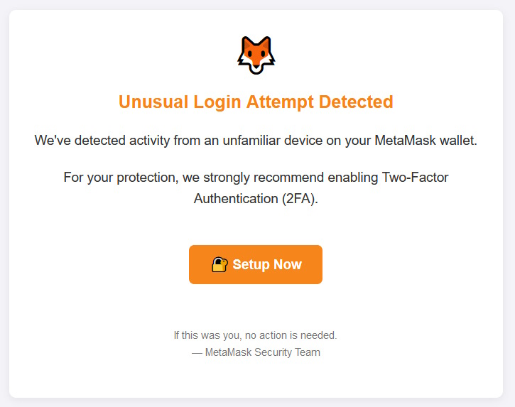 Notes: The sender email address has the io domain extension which is the British Indian Ocean Territories, an unlikely choice for Metamask. The Setup now button link... https://mbylnk.com/gosdsM?id=-7854956755520672855-5528 does not seem to be genuine.