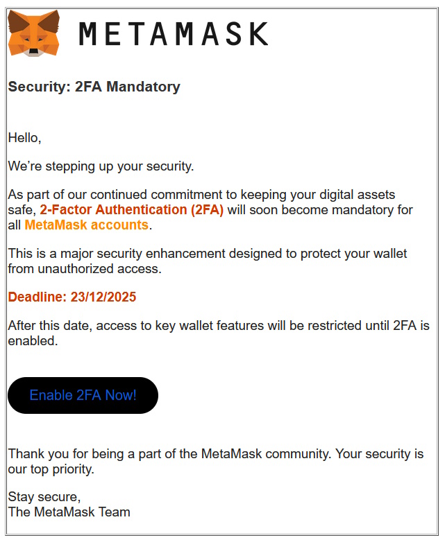 Sloppy designed email but so long as they harvest the lowest hanging fruit the email has done it's job. Metamask communications should come from an official metamask email address matching the domain of their official website. Again a firebaseapp.com email which seems to be a platform scammers are increasingly using these days. The click through link: https://2fawallet.https://2fawallet.metamaskseed.com/ The domain name was only regsitered on the 14th December 2025, 5 days before the email was sent out... a definite "red flag".