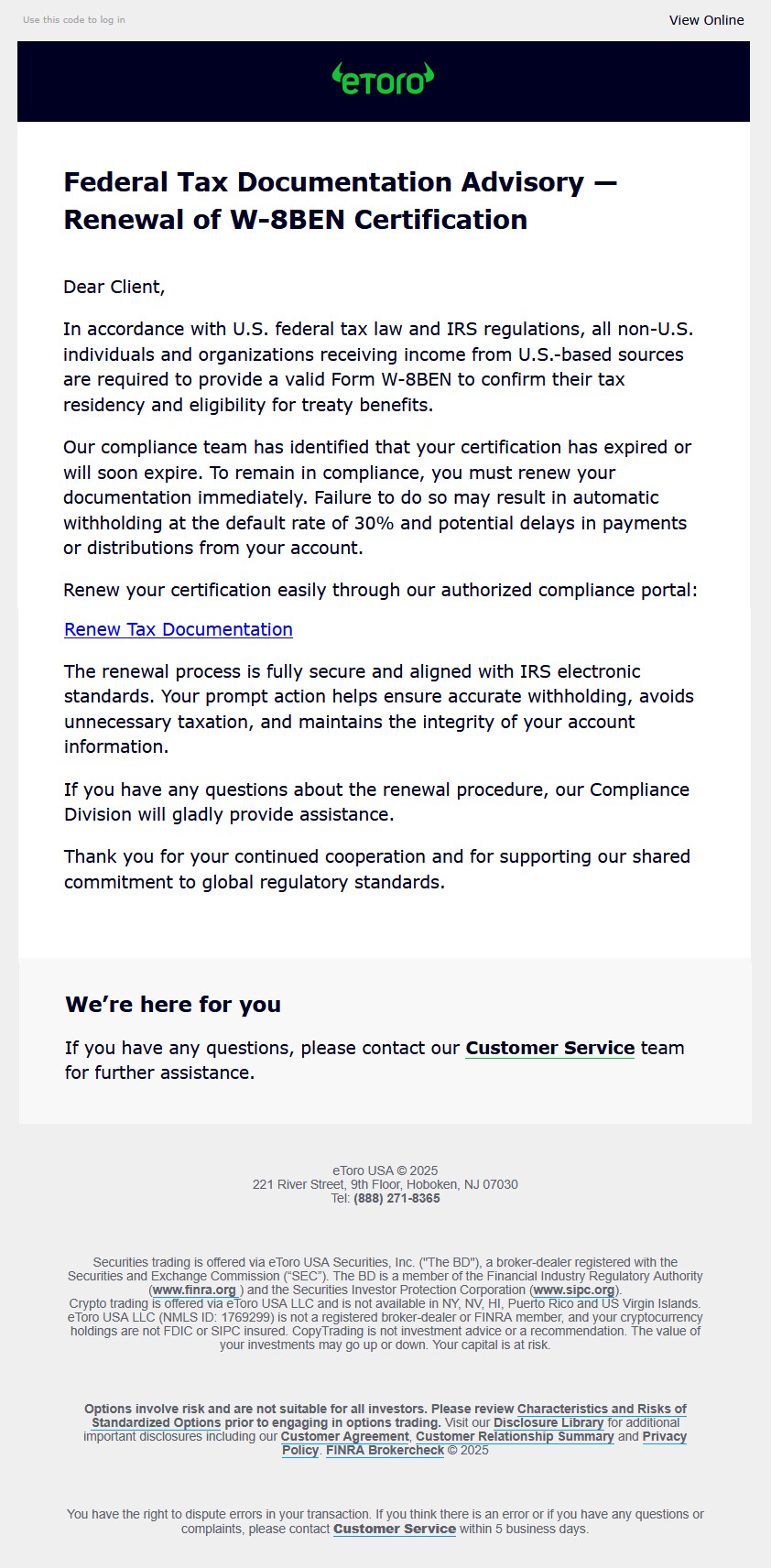 Subject: Federal Tax Documentation Advisory — Renewal of W-8BEN Certification